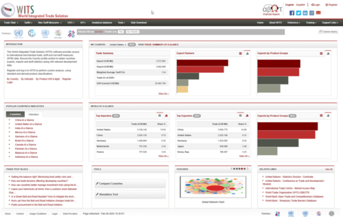 The World Integrated Trade Solution (WITS) is an online data platform that provides comprehensive trade-related data, tariff data, Non-Tariff Measures (NTMs), data on trade agreements, and indicators & Analytical Tools. It was developed by the World Bank, in collaboration with organizations such as the United Nations Conference on Trade and Development (UNCTAD), the International Trade Centre (ITC), the United Nations Statistics Division (UNSD), and the World Trade Organization (WTO).