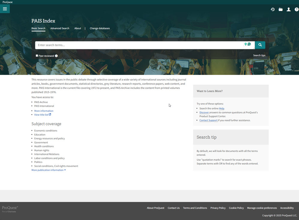 The PAIS® Index is a public policy database that tracks scholarship and policy research in public affairs, social sciences, and international relations. First developed in 1914 to organize literature on important public issues, PAIS provides a comprehensive index of journal articles, books, government documents, statistical reports, conference proceedings, and gray literature from around the world.