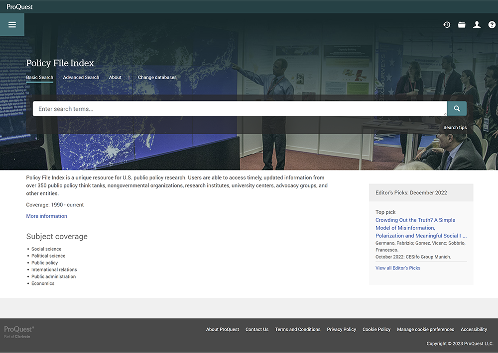 Policy File Index is a ProQuest database that provides public policy research and analysis produced by think tanks, nongovernmental organizations, research institutes, and university centers. It covers topics such as economics, foreign policy, security, environment, education, and social issues. It also includes materials such as policy briefs, reports, and working papers, which are primarily published in the United States.