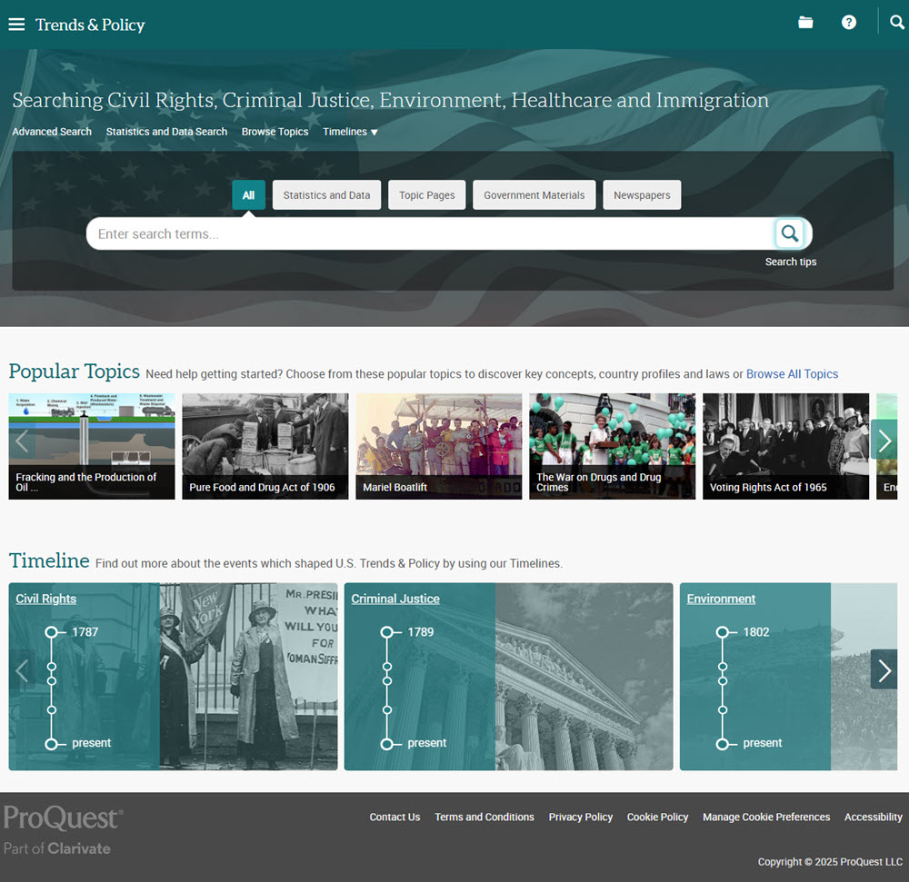 ProQuest Trends and Policy compiles primary source documents related to U.S. government policy. It includes congressional hearings, committee prints, reports, legislative research studies, and other materials that document the development of public policy over time. The resource is organized around the following key topics: Civil Rights, Civil Criminal Justice, Environment, Healthcare, Immigration, Taxes, and the IRS.