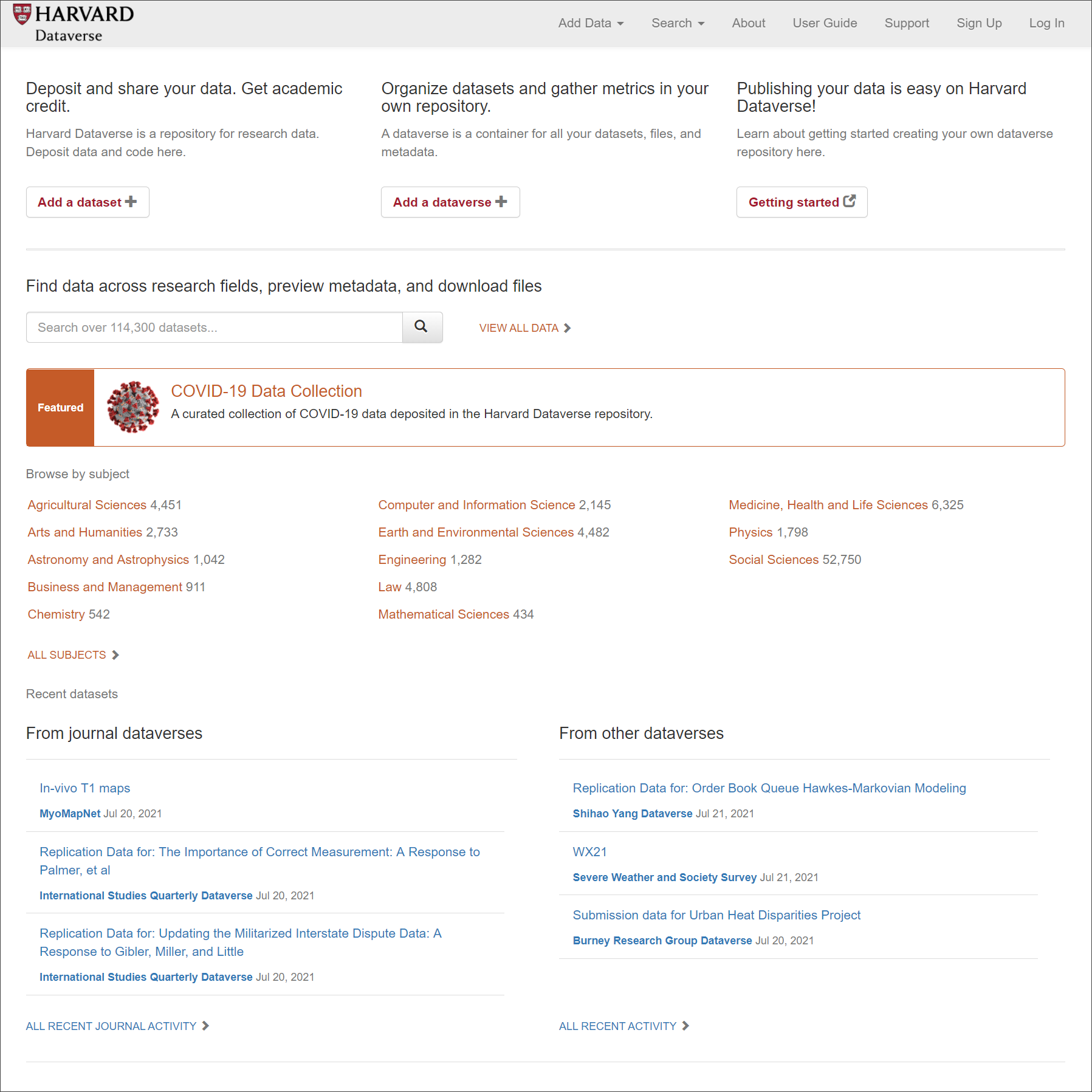 Harvard Dataverse is an open-access data repository developed and maintained by Harvard University that allows researchers to share, store, cite, and explore research data across multiple disciplines. It is part of the Dataverse Project, an open-source platform institutions use worldwide to manage and disseminate datasets. Although anyone can search for and download datasets, some may restricted.