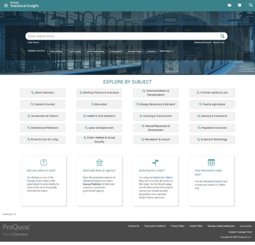 ProQuest Statistical Insight provides over a million statistics, tables, statistical reports, publication abstracts, and datasets from more than 22,500 sources. The database provides statistical data from U.S. federal agencies, state governments, private organizations, and major intergovernmental organizations such as the UN, OECD, and EU.